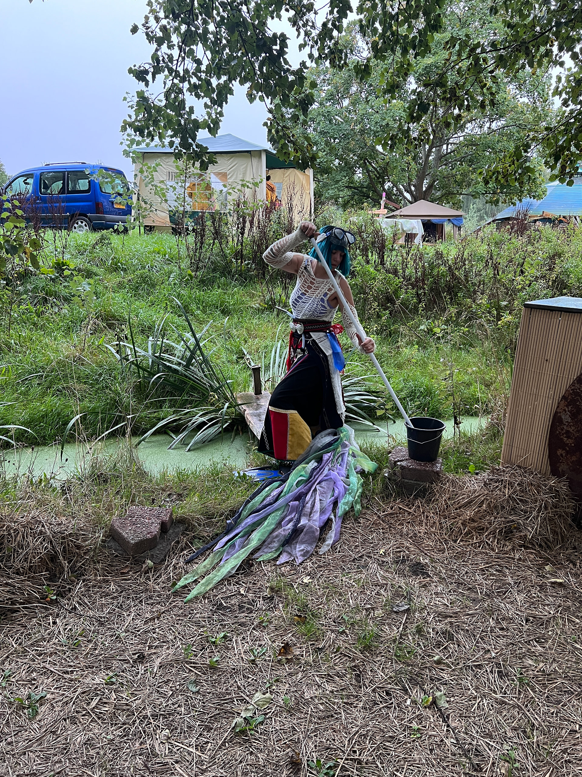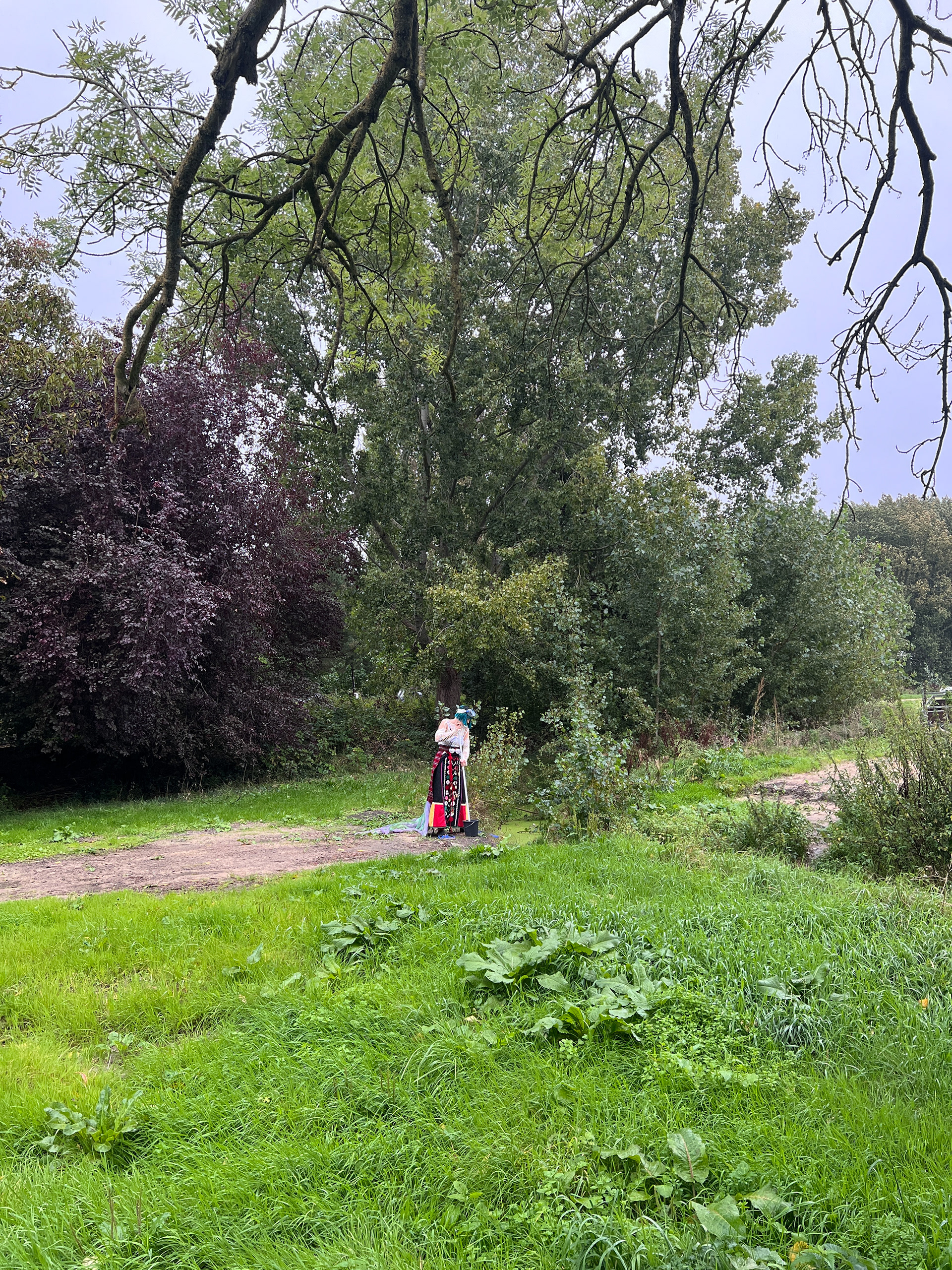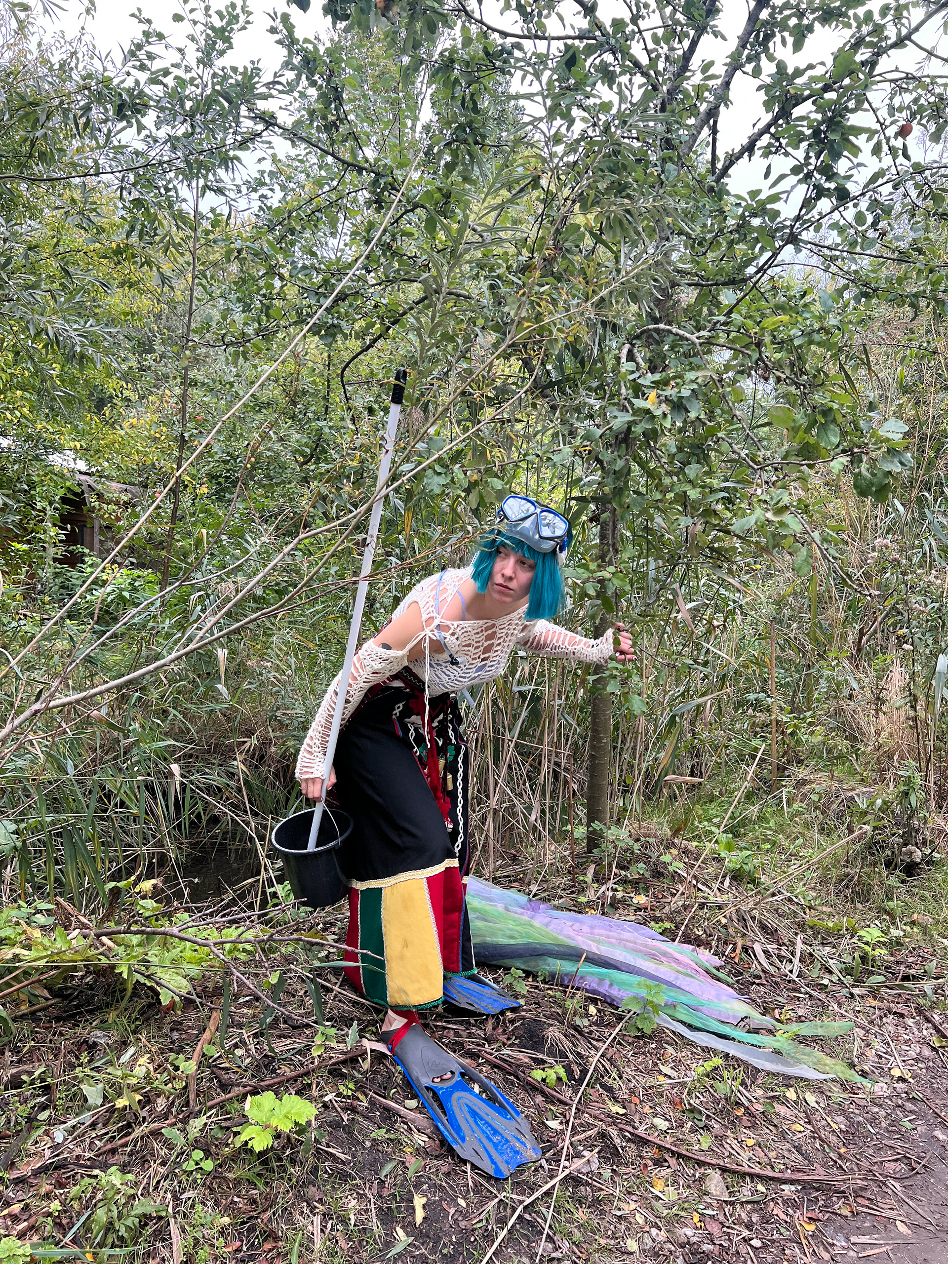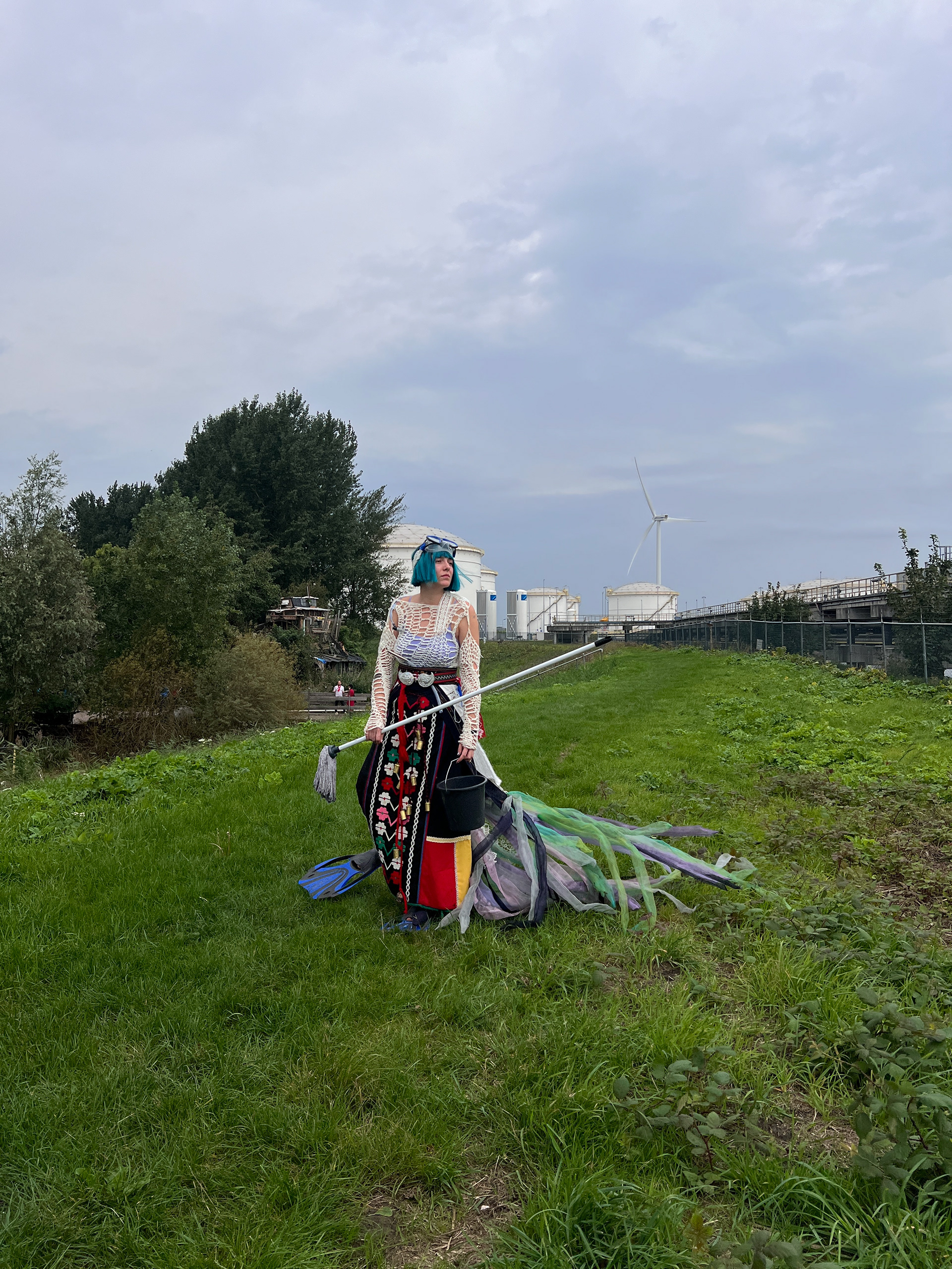 I have been exploring the Bulgarian folklore spirit, samodiva, and her image. She is a healer and always bound to water, questioning human relationships with the non-human world. In Ruigoord, she felt compelled to take care of the waters around the village. With a heavy costume, her presence dragged. She drifted and jolted, announcing her approach by the chiming bells on her skirt. Encountering people on her way, she asked them for help. It was a maintenance cycle, a task with an absurd purpose: cleaning the waters with a mop and a sponge, over and over again.ย