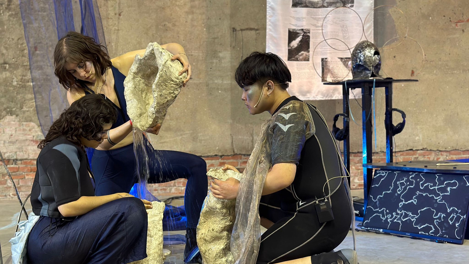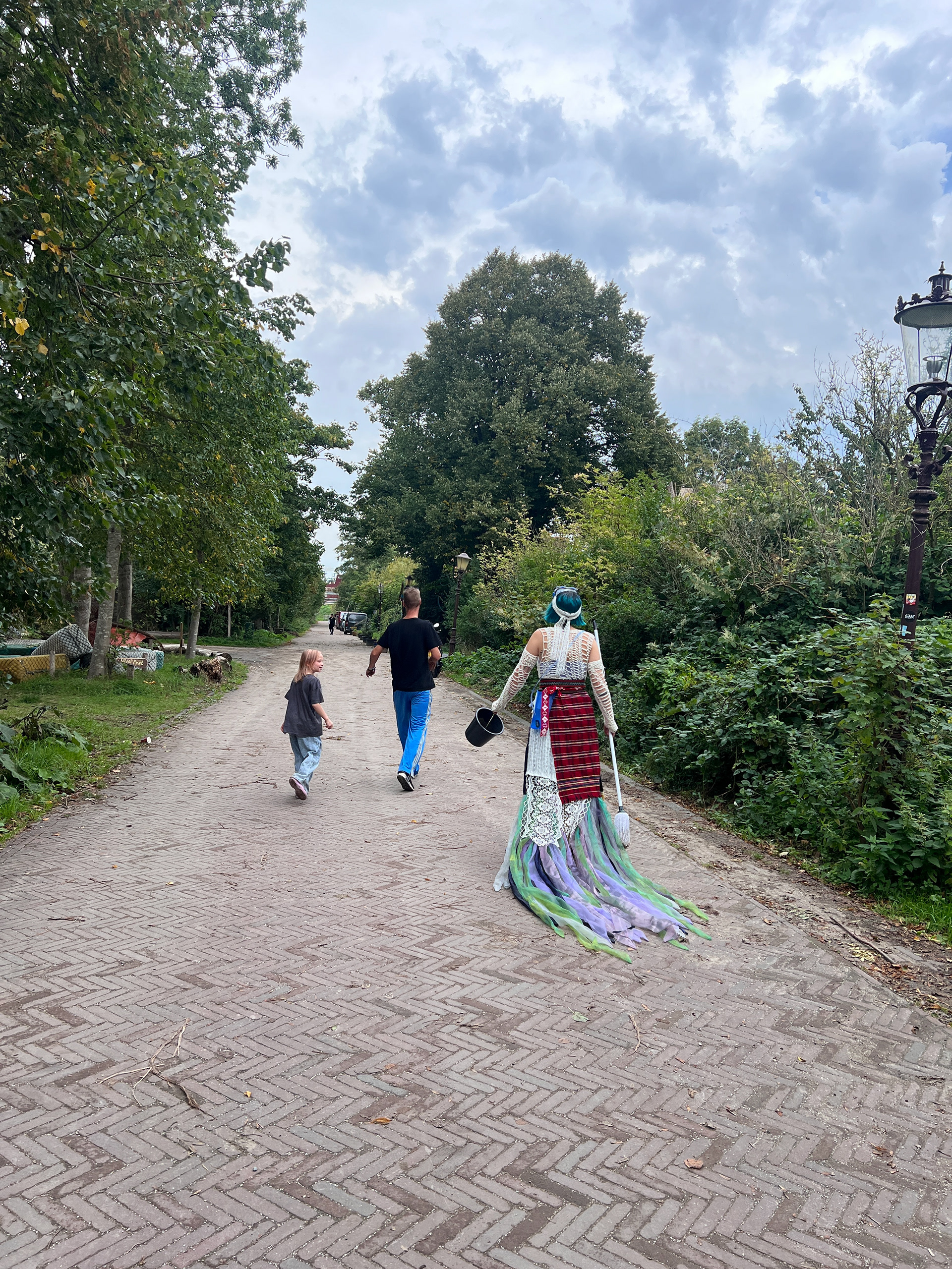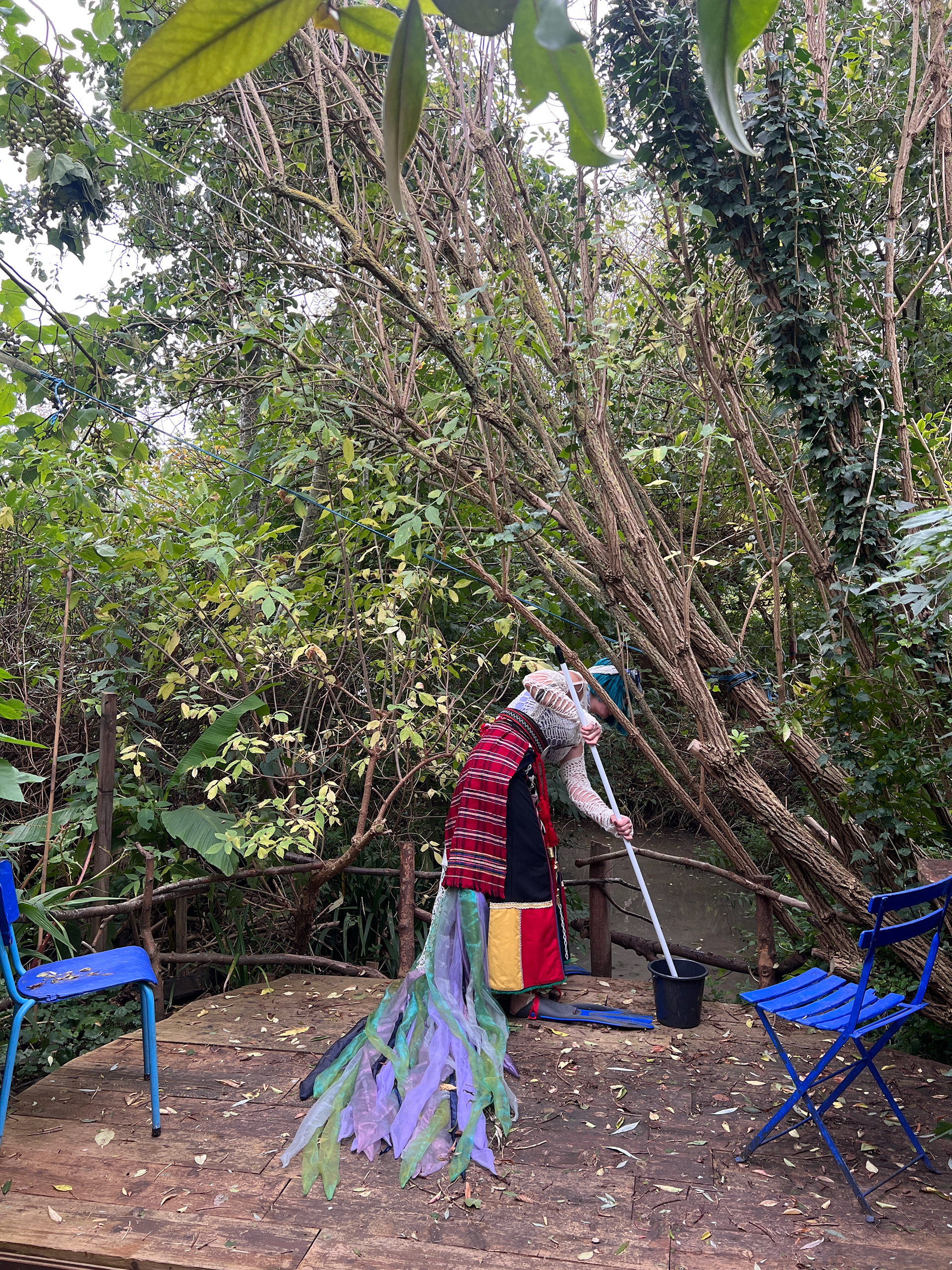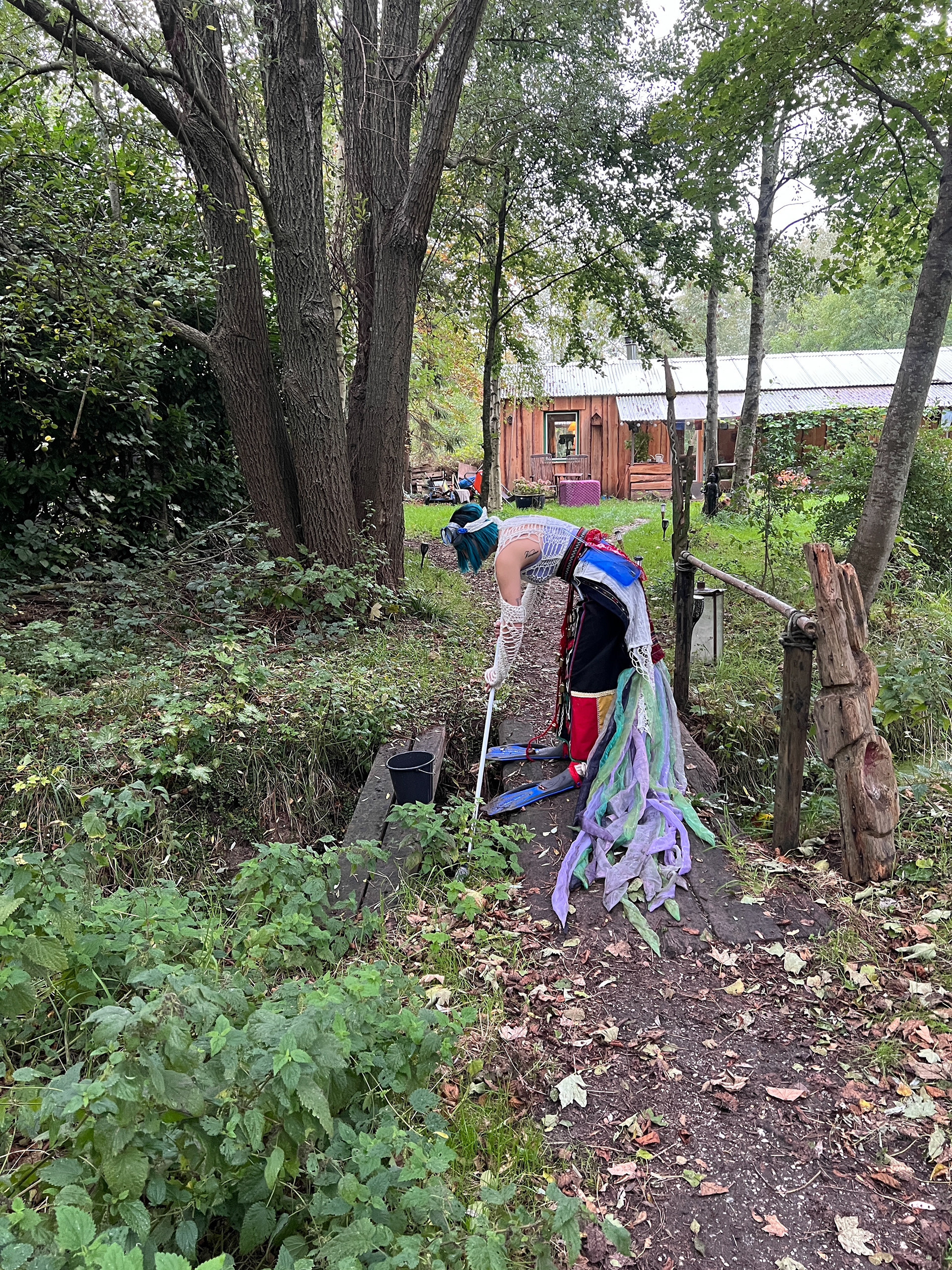 I have been exploring the Bulgarian folklore spirit, samodiva, and her image. She is a healer and always bound to water, questioning human relationships with the non-human world. In Ruigoord, she felt compelled to take care of the waters around the village. With a heavy costume, her presence dragged. She drifted and jolted, announcing her approach by the chiming bells on her skirt. Encountering people on her way, she asked them for help. It was a maintenance cycle, a task with an absurd purpose: cleaning the waters with a mop and a sponge, over and over again.ย