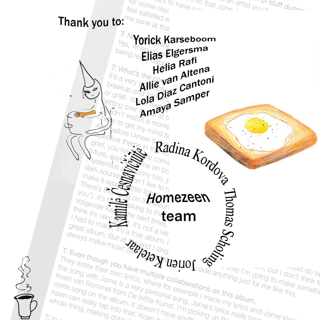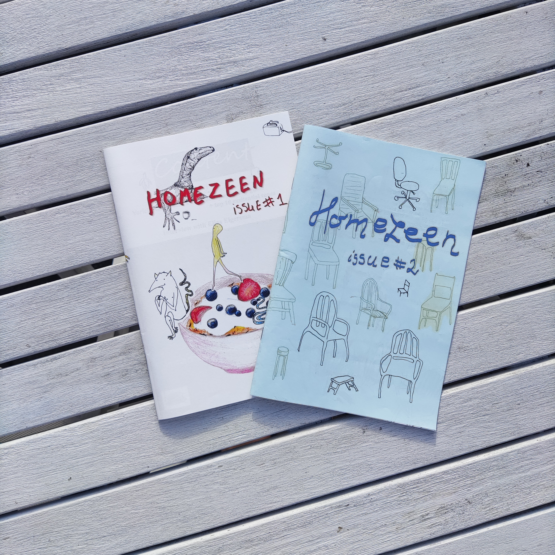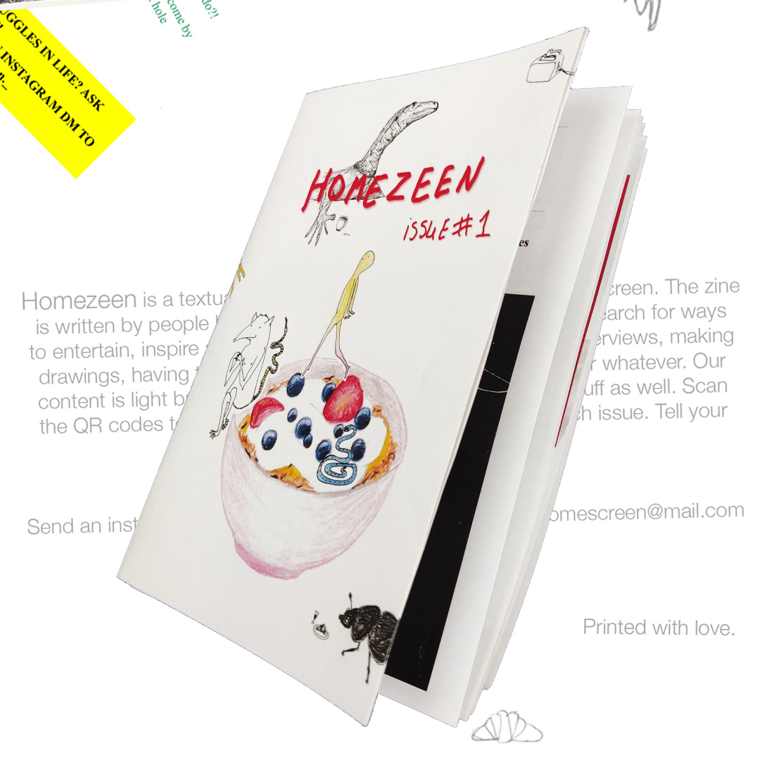 "A zine for your eyes to look at besides the screens weโve grown to be more and more attached to, especially during this pandemic. Homezeen searches for ways to entertain, inspire, and connect ourselves and our readers by holding interviews and talks, making drawings, and puzzles, sharing recipes, making music, and whatever. It is a physical extension of the online art space Homescreen on Instagram, where many artists and musicians were featured. Now Homezeen wants to keep close to home and focus on checking in on the community in and around our hometown of Groningen, the Netherlands. The first edition of the zine contains interviews with musician Elias Elgersma, artist Allie van Altena, artist Helia Rafi, and various contributions from people in our community. "