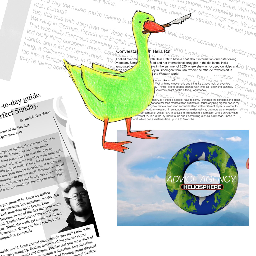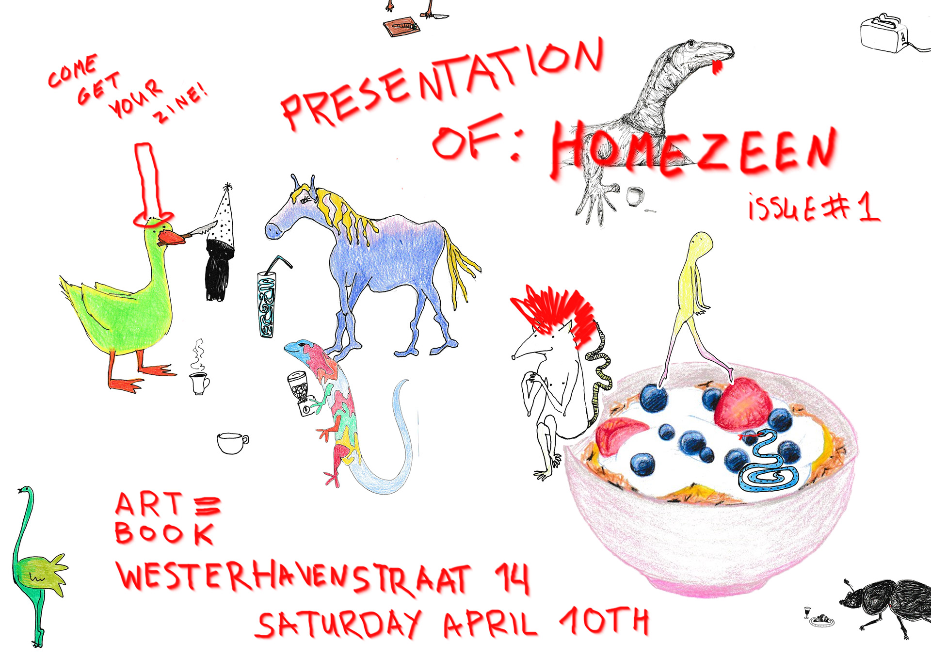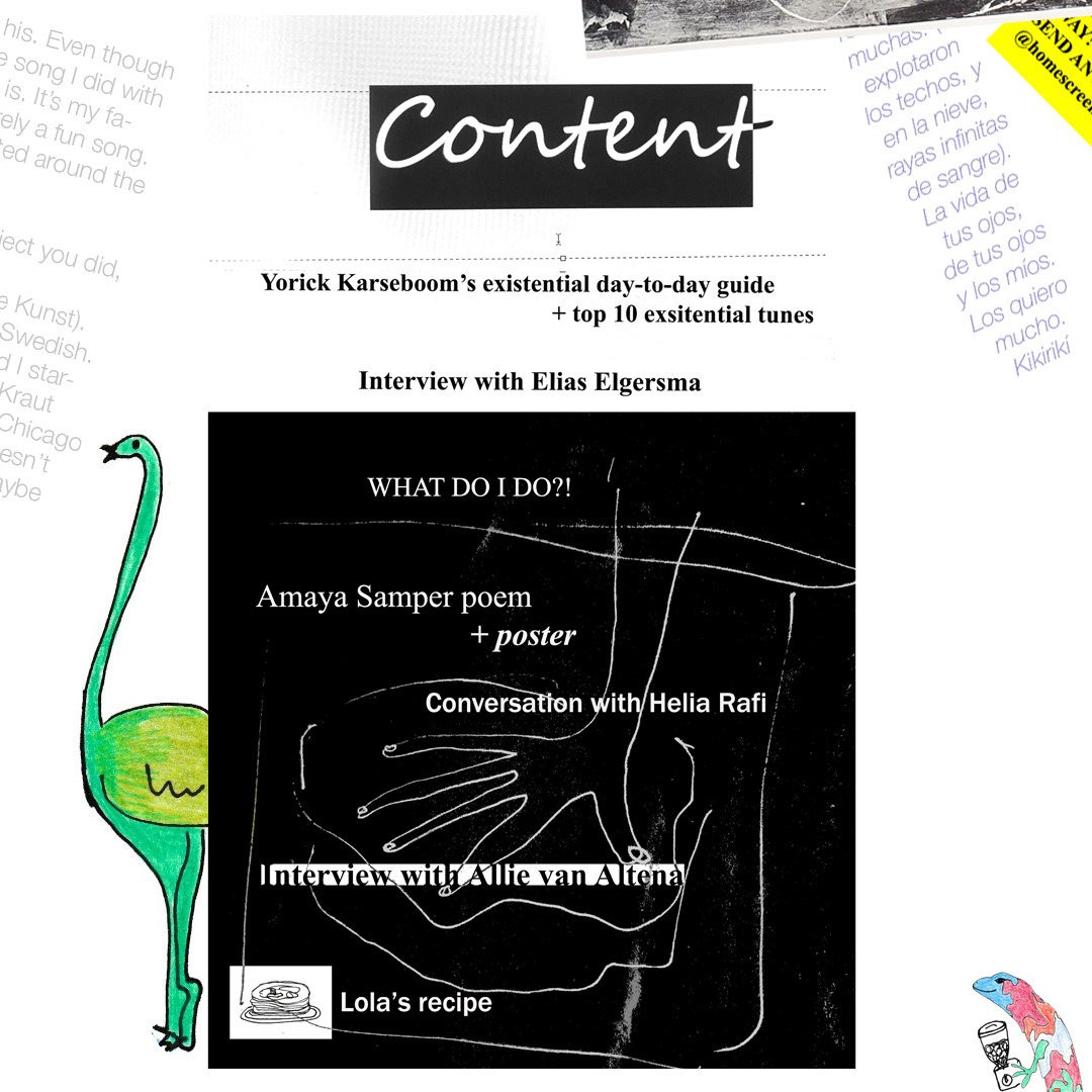 "A zine for your eyes to look at besides the screens weโve grown to be more and more attached to, especially during this pandemic. Homezeen searches for ways to entertain, inspire, and connect ourselves and our readers by holding interviews and talks, making drawings, and puzzles, sharing recipes, making music, and whatever. It is a physical extension of the online art space Homescreen on Instagram, where many artists and musicians were featured. Now Homezeen wants to keep close to home and focus on checking in on the community in and around our hometown of Groningen, the Netherlands. The first edition of the zine contains interviews with musician Elias Elgersma, artist Allie van Altena, artist Helia Rafi, and various contributions from people in our community. "
